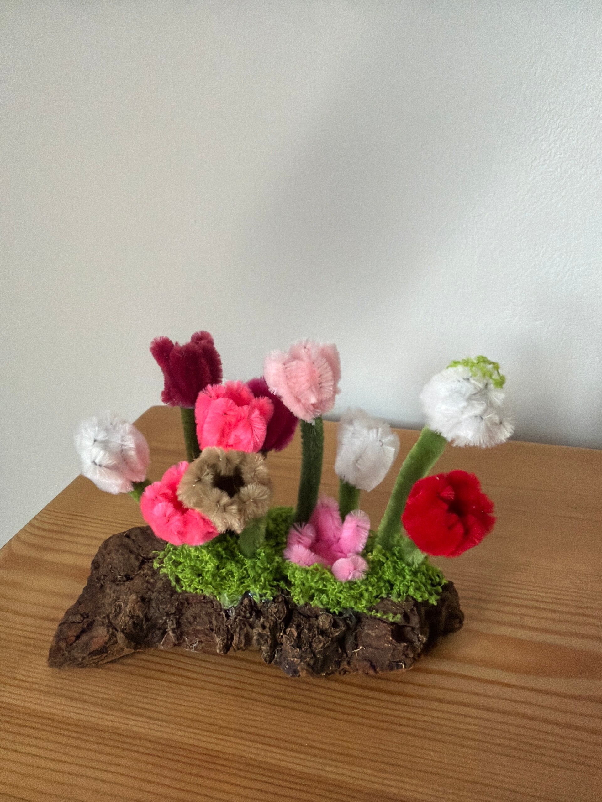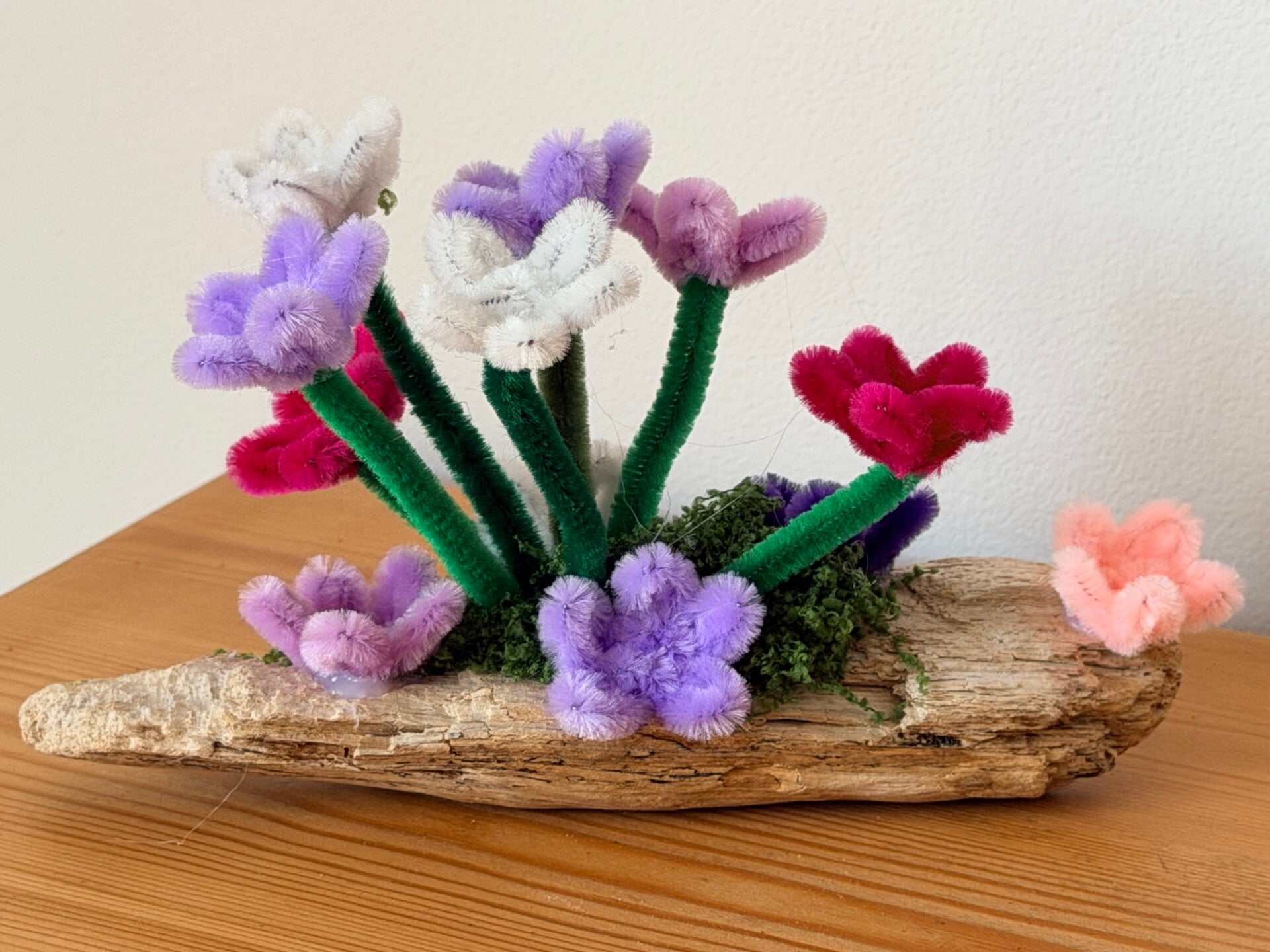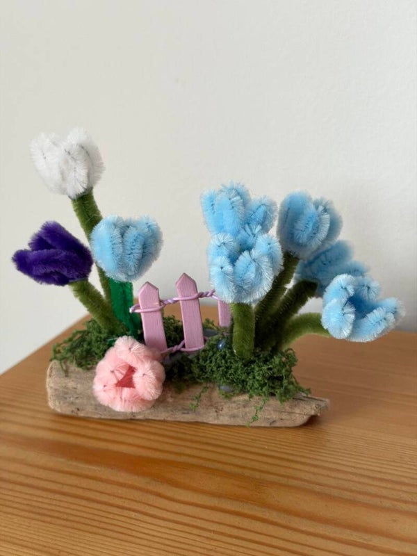I carefully select driftwood adding small pipe cleaner flowers in a multitude of colours and designs