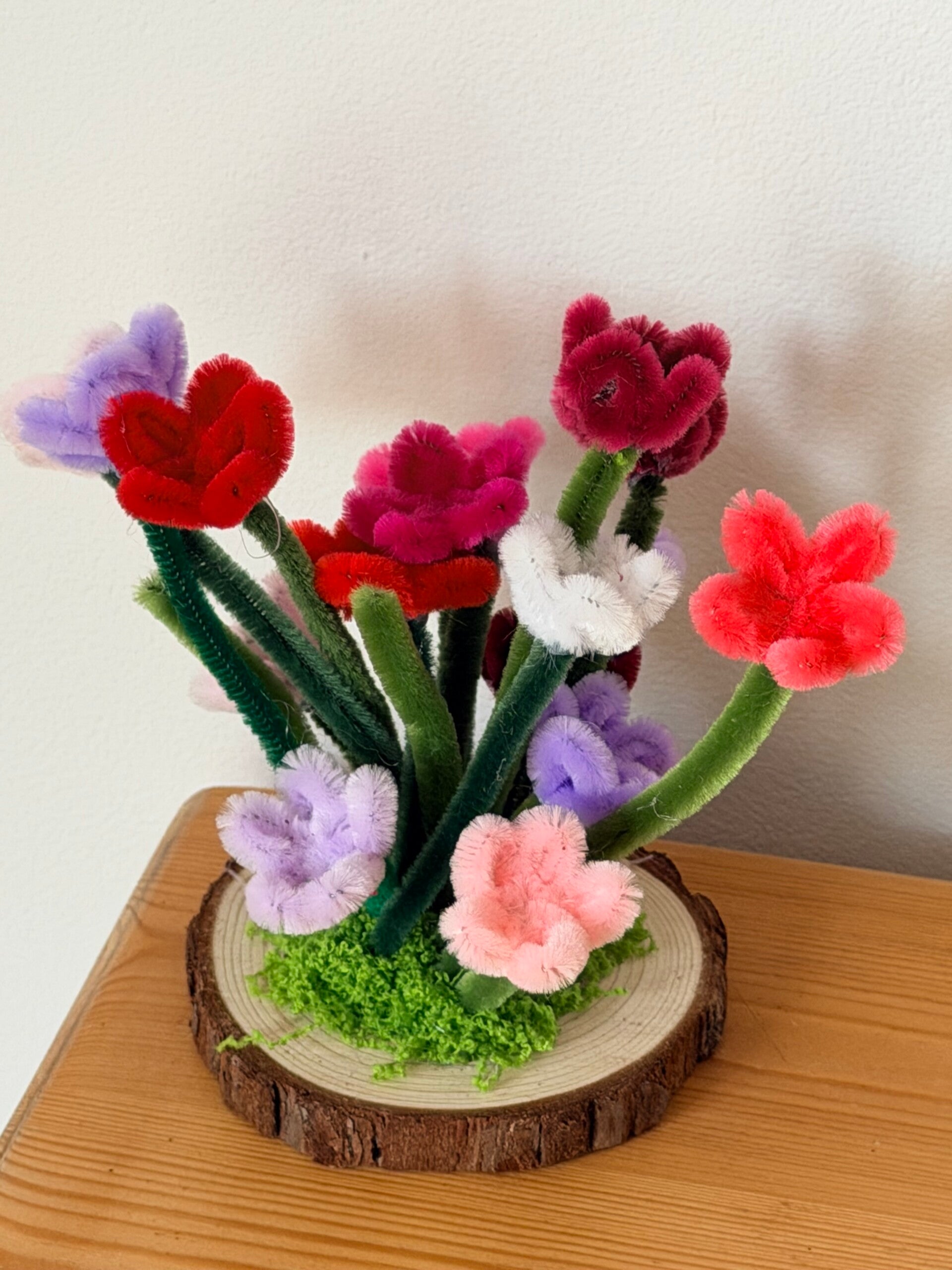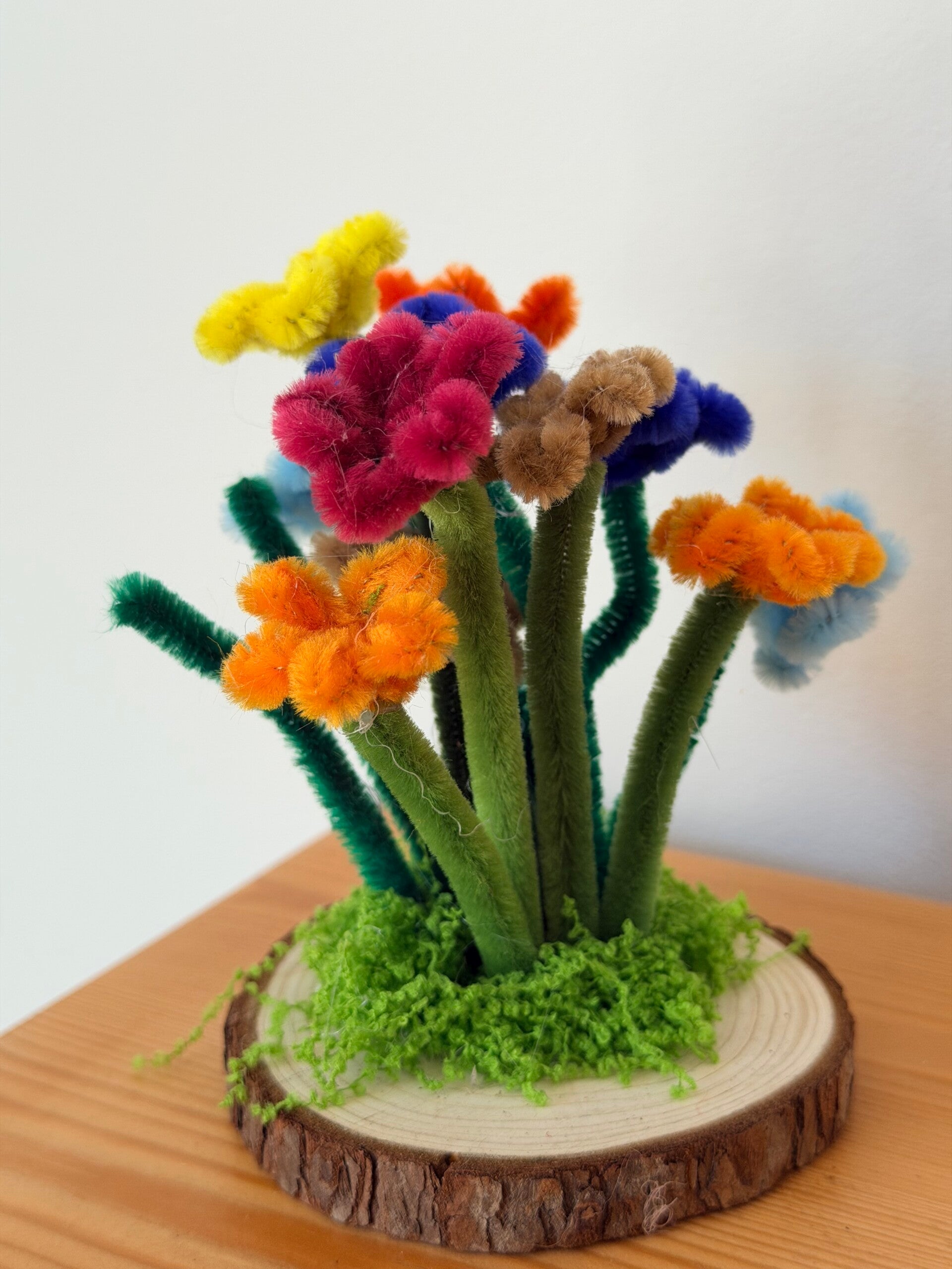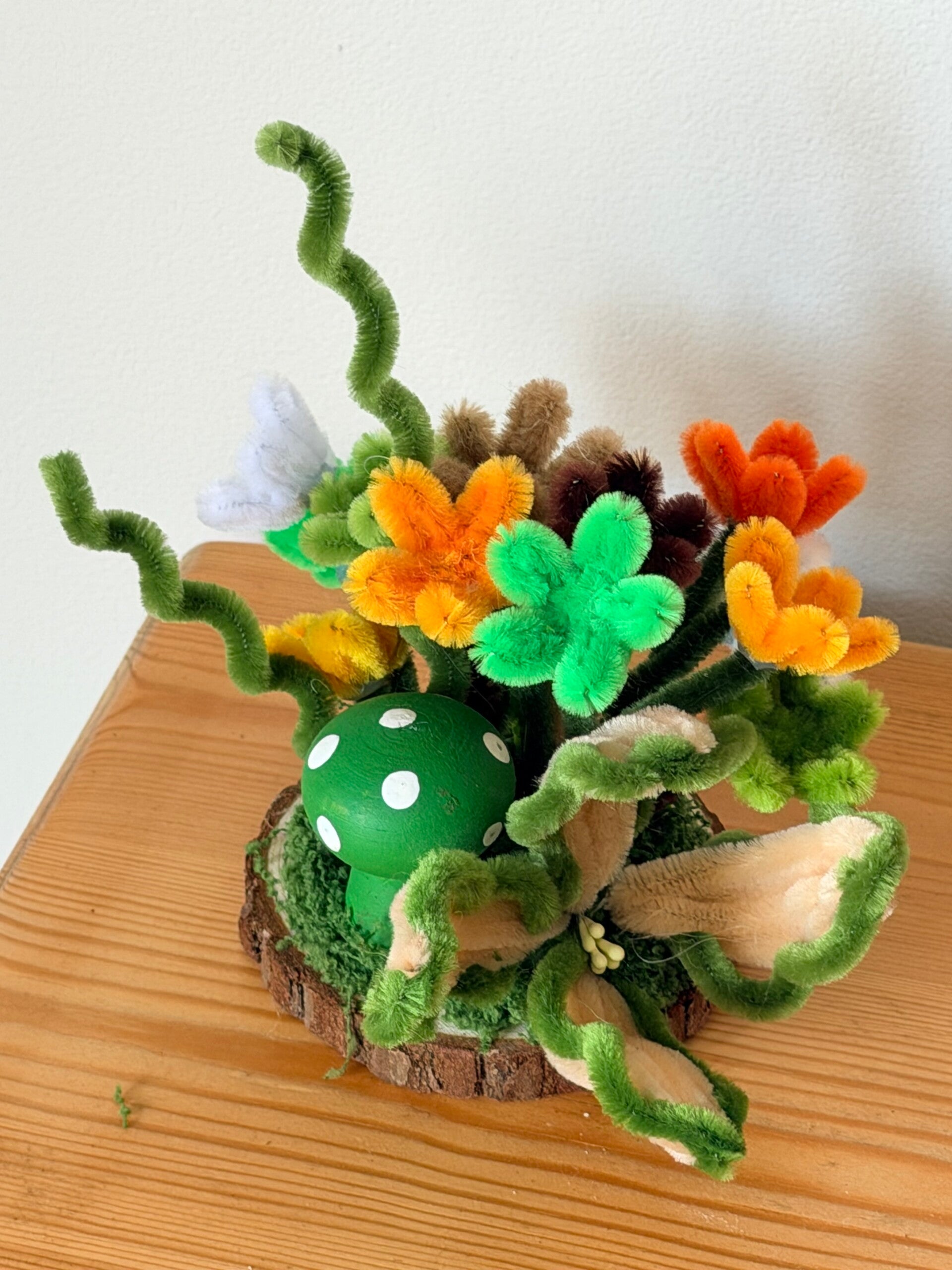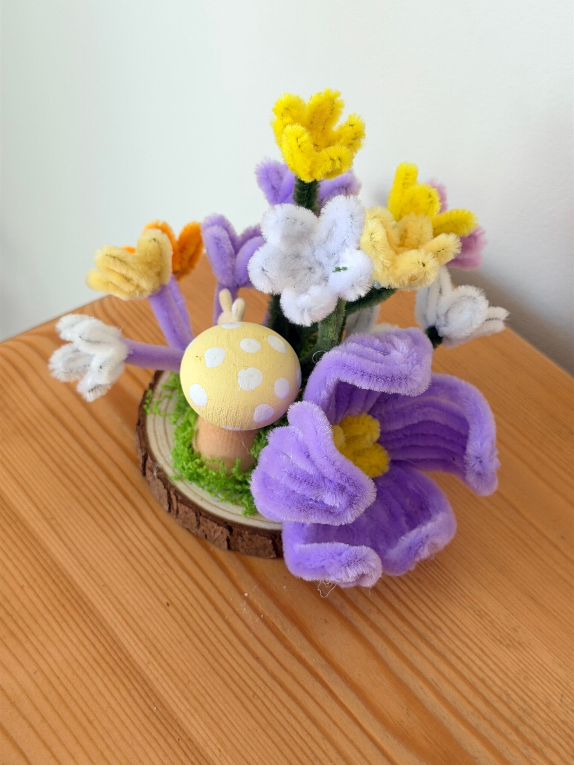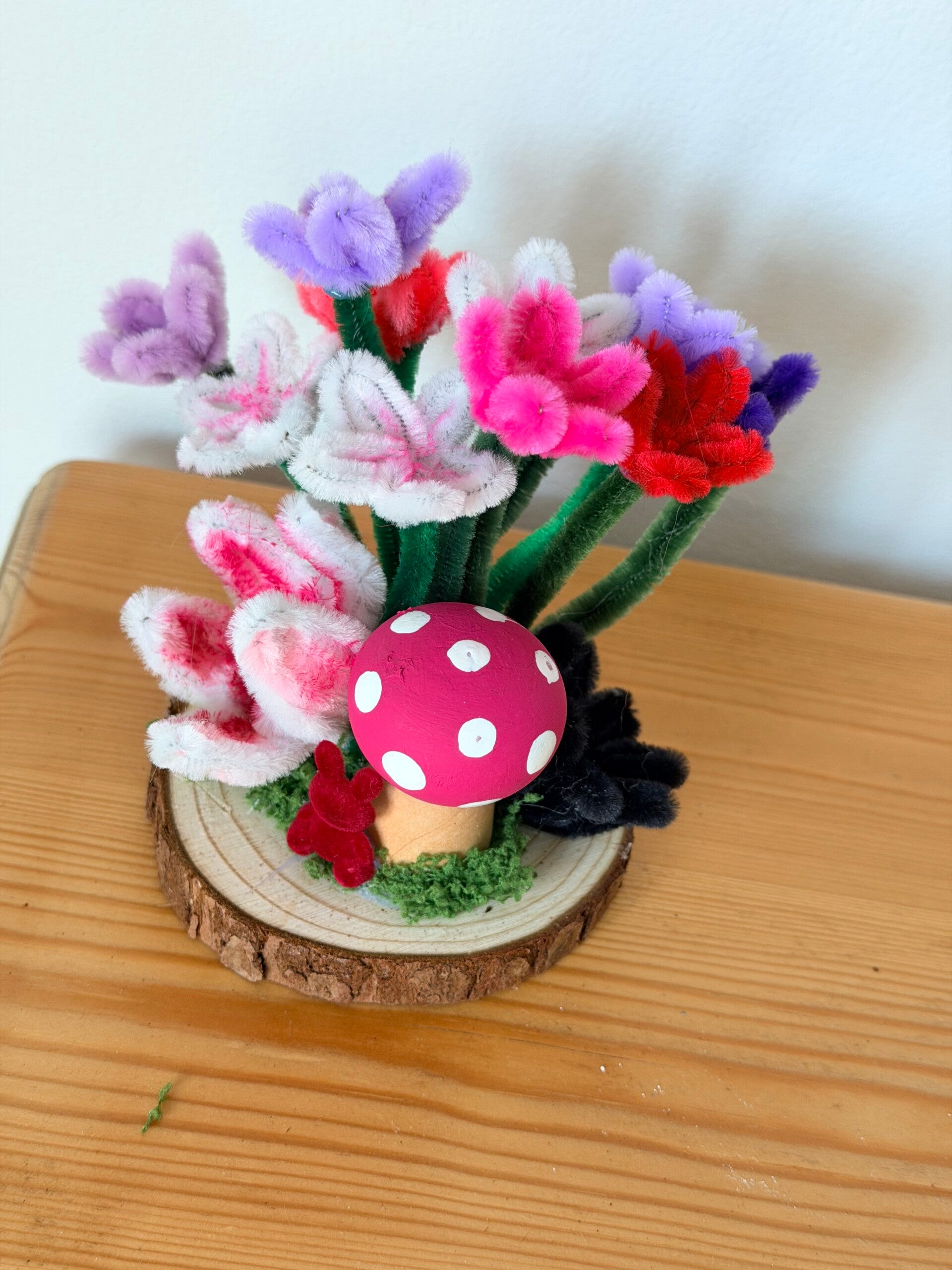 This collection I use sliced cut logs to create a woodland style scene, adding small pipe cleaner flowers.