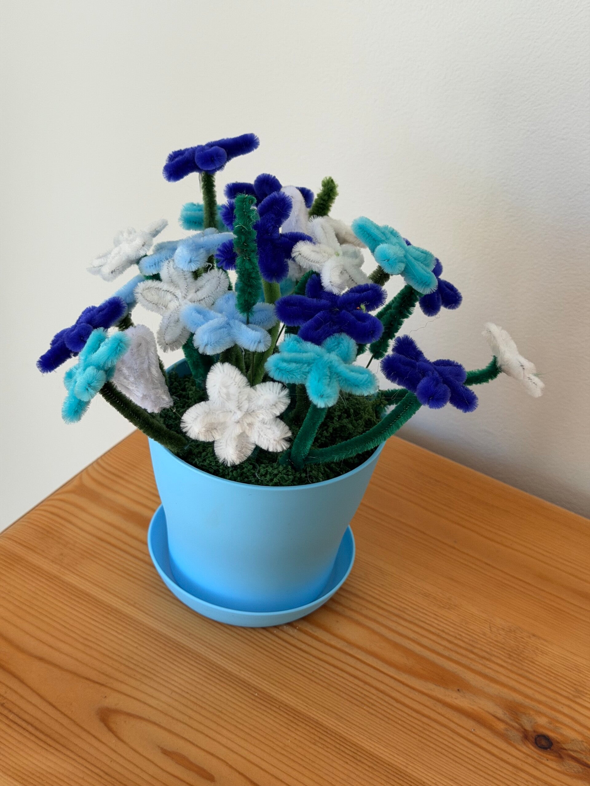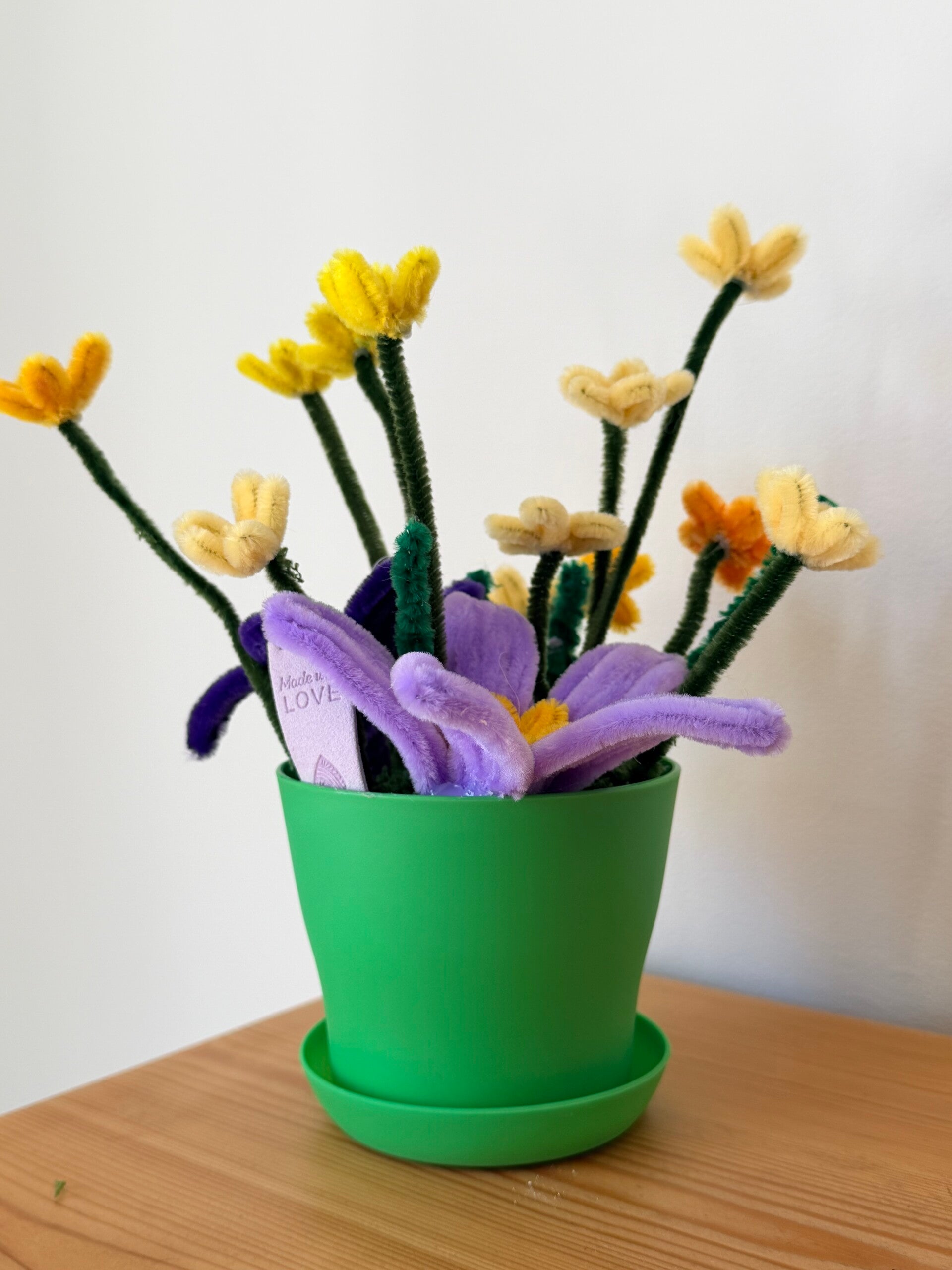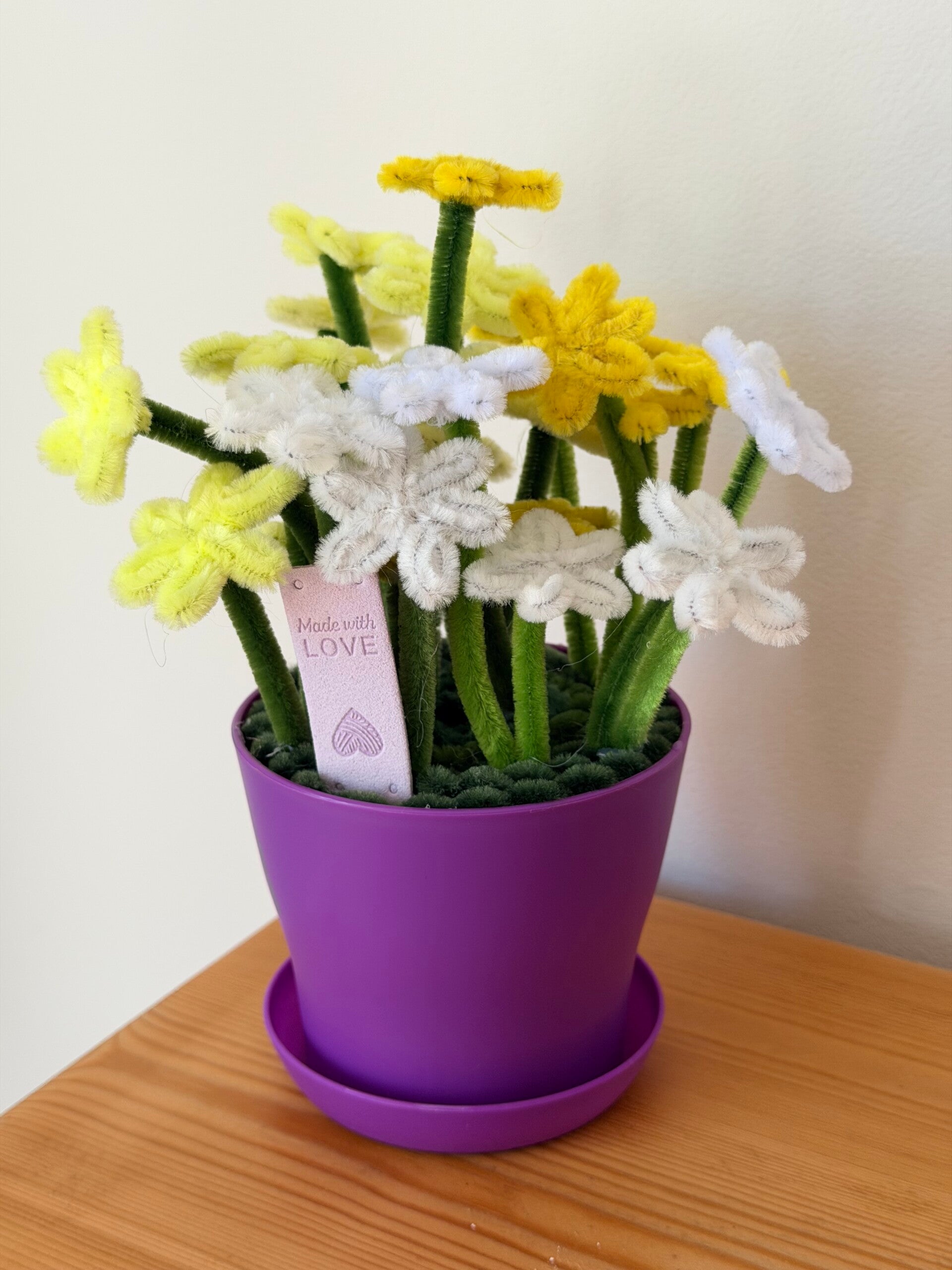 This collection uses a approx 15cm coloured pot and saucer with Daisy style pipe cleaner flowers in a variety of styles and colours.