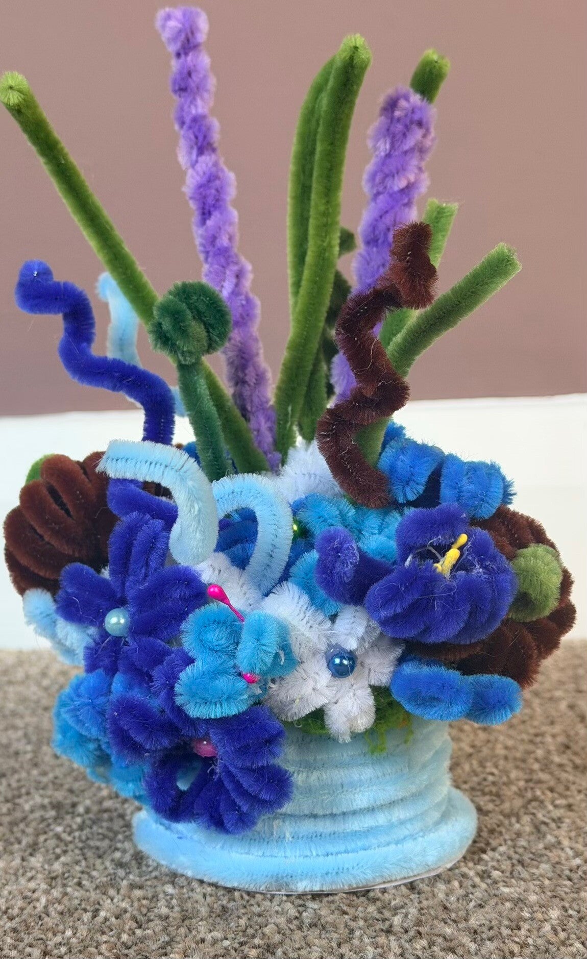 This design uses a large cotton reel and an array of pipe cleaner flowers are added.