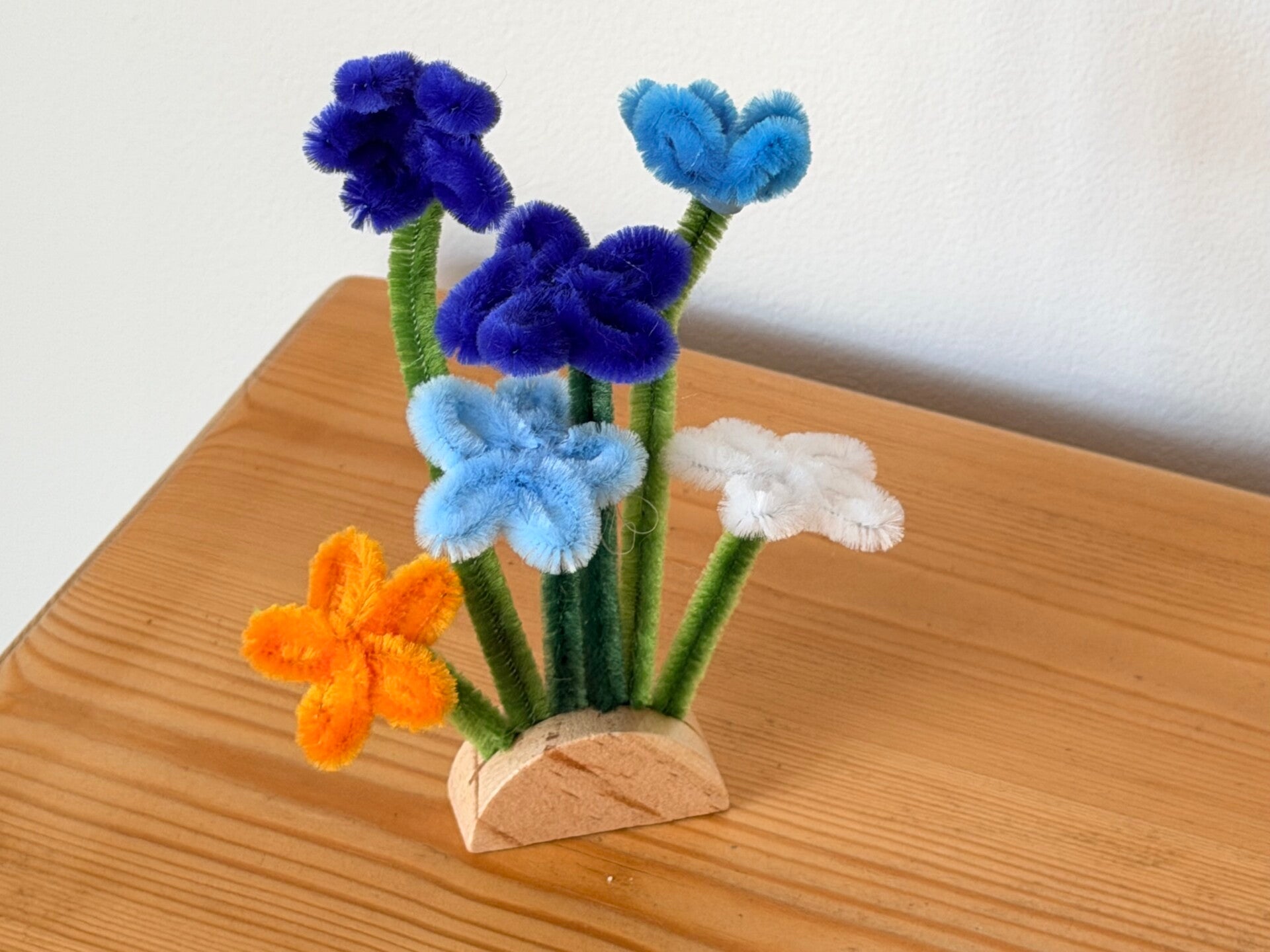 This collection uses half circular wood style pieces inserting small daisy style pipe cleaner flowers.